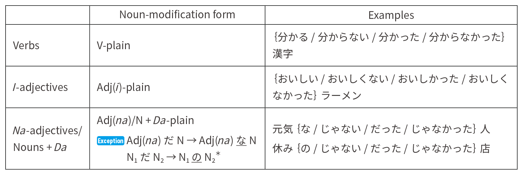 [F] The final elements of relative clauses (i.e., the parts directly before the modified nouns) must be in the noun-modifying forms. Those of verbs and i-adjectives are the same as their plain forms. (6) summarizes the noun-modifying forms for verbs, i-adjectives and na-adjectives/nouns+Da :