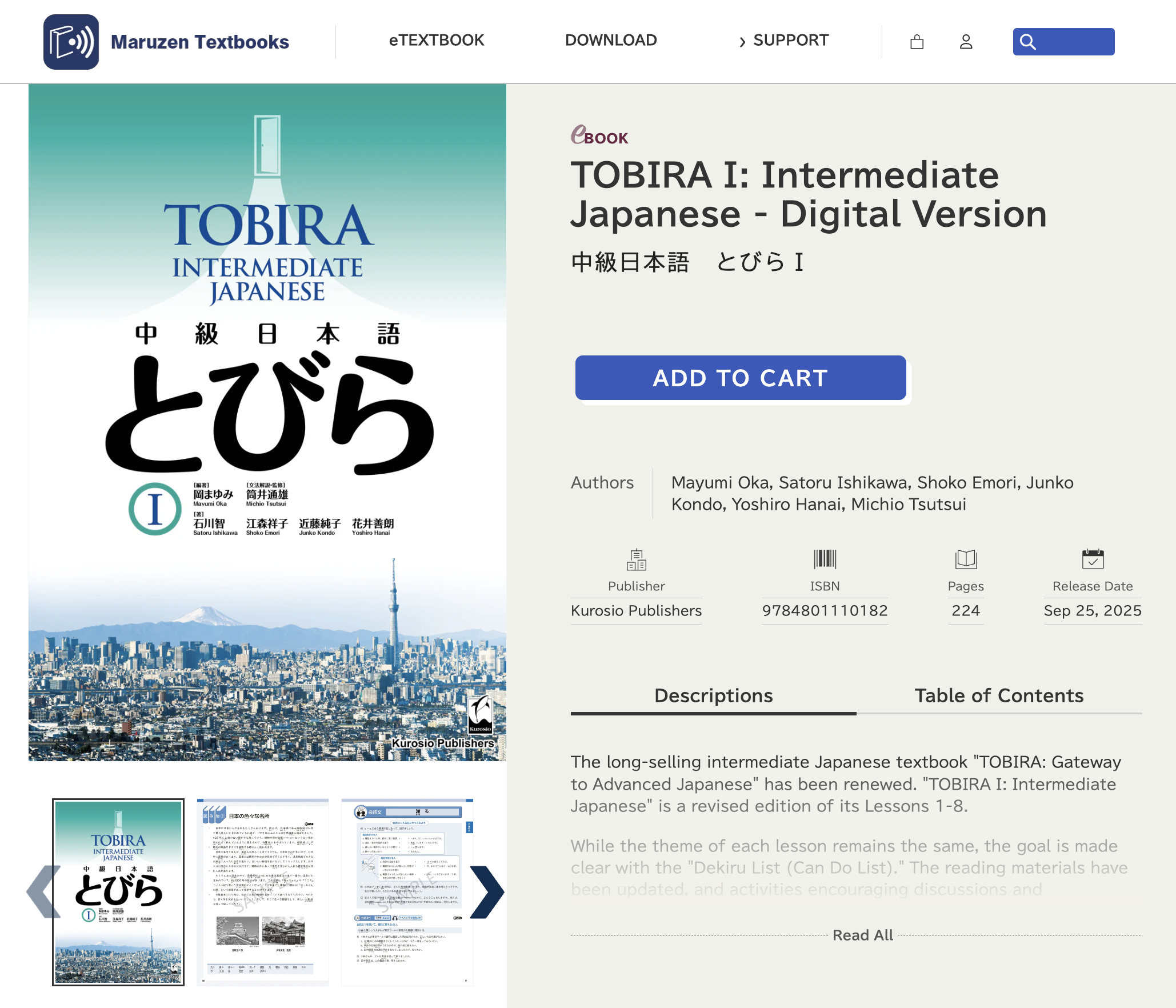 『中級日本語 とびら I 』の電子書籍版は、丸善雄松堂の電子教科書・電子教材配信サービス「Maruzen eText Service(EDX UniText)」で取り扱っています。