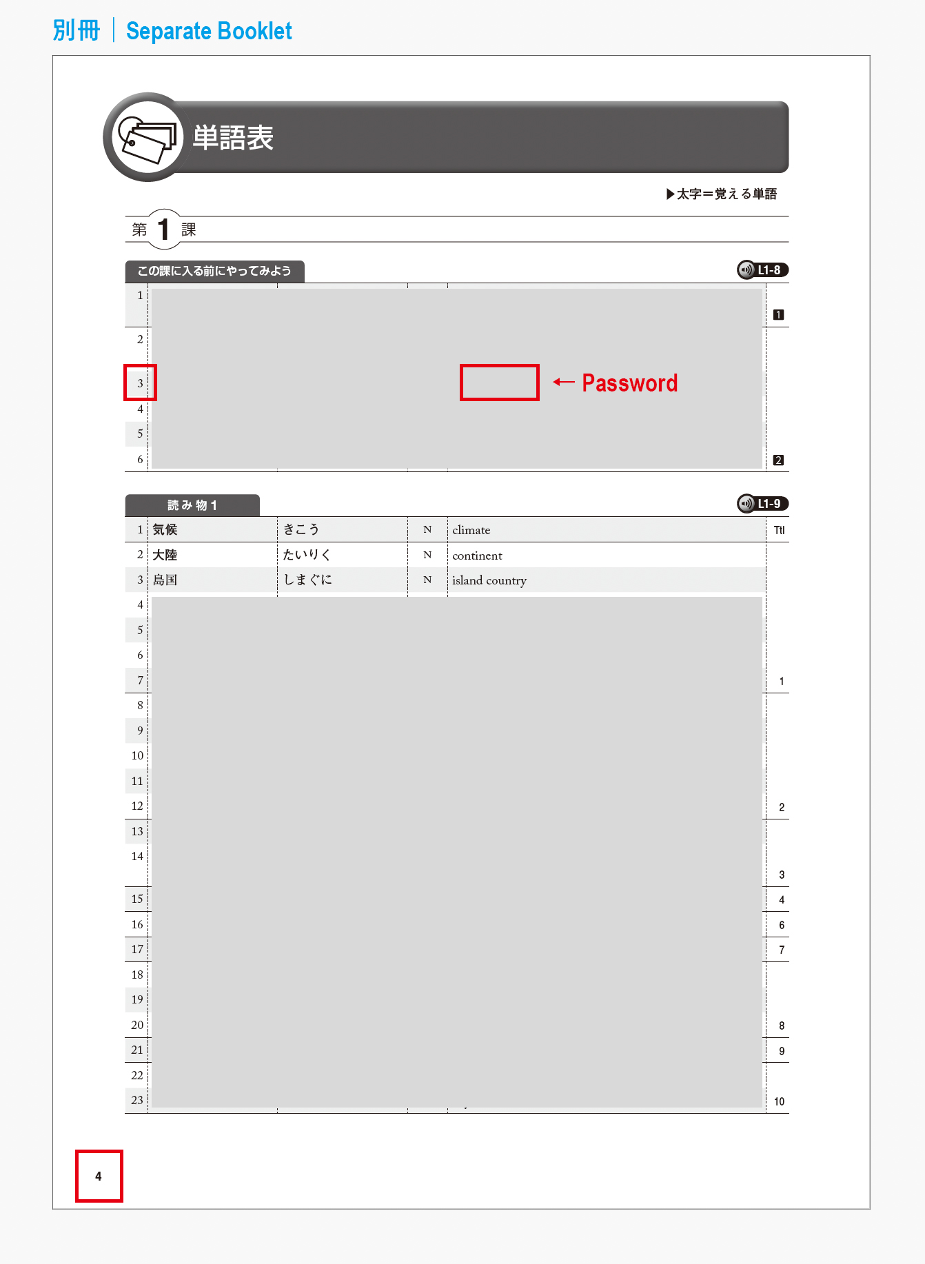 別冊4ページ「単語表」、第1課「この課に入る前にやってみよう」の3番目の単語英訳を入力してください。下記リンク先の画像も参考にしてください。